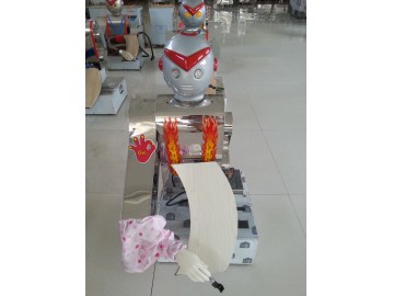 1)将刀削面机器人安置稳固后,插上220V电源,(电源不稳定地区建议使用稳压器连接,确保地线连接正常),待眼睛指示灯闪亮数秒,无任何异常,即可进行下一步操作。